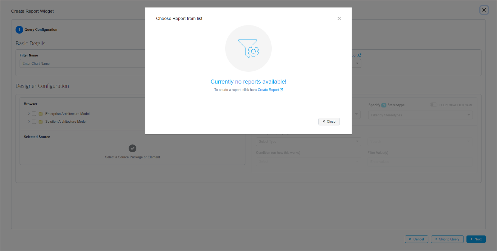 Click Skip Report to land on the designer configuration section of EA Report Widget