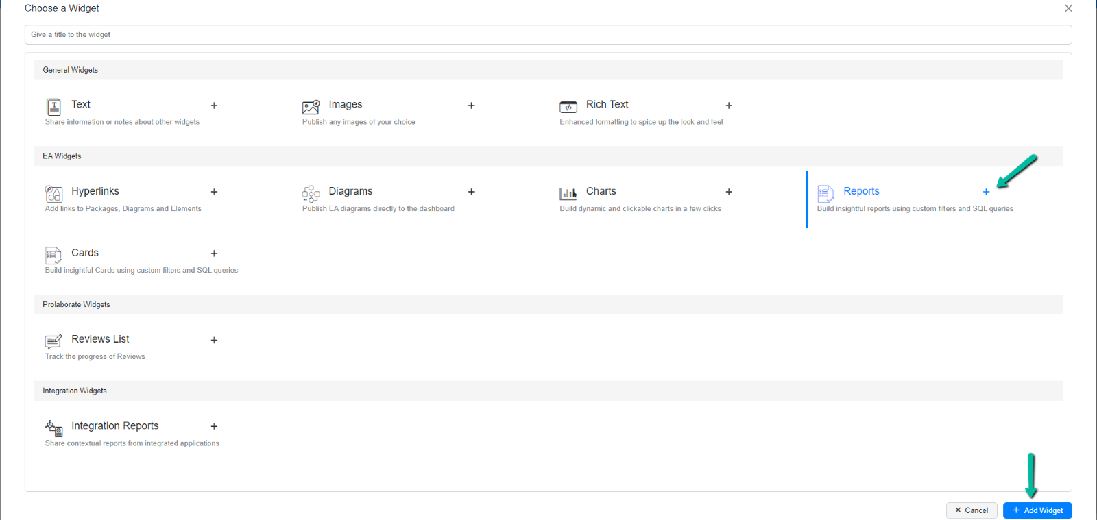 In Choose a Widget window, select Reports Widget and click Add Widget.