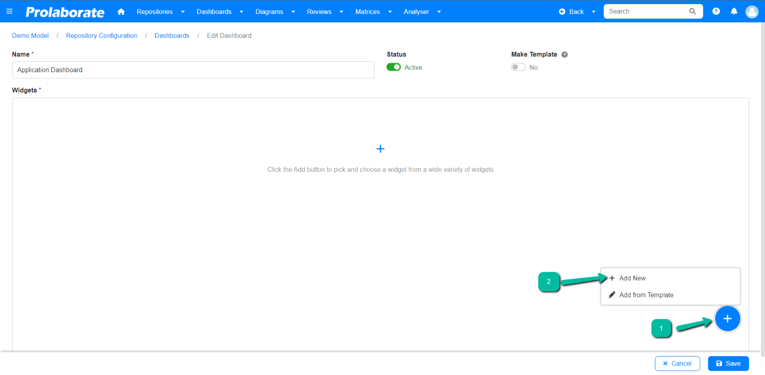 To add a report widget to a dashboard, click the Add Widget > Add New.