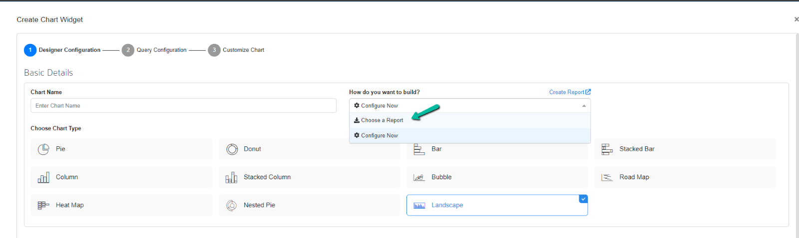 In Create Chart Widget, follow the below steps to create a Landscape chart using designer configuration.