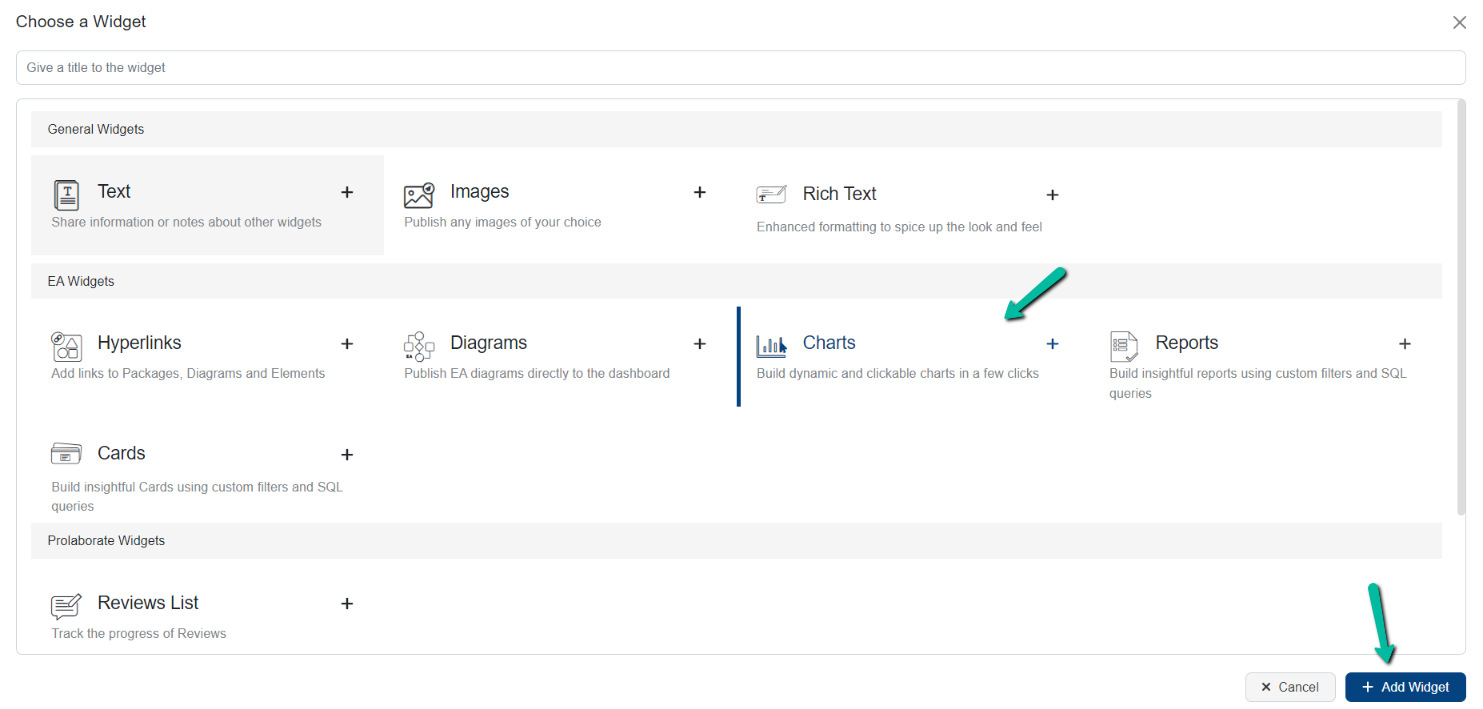 In Choose a Widget window, select the Chart type widget and click Add Widget.