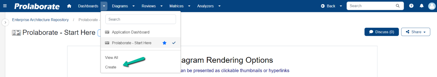The first step is to create a dashboard or use an existing dashboard which incorporates the charts as a widget. A new dashboard can be created by choosing Create from the dropdown in the header menu.
