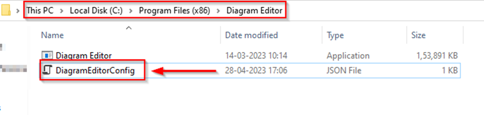 The config file is located in C:\Program Files (x86)\Diagram Editor, and you can find the DiagramEditorConfig.json file there.