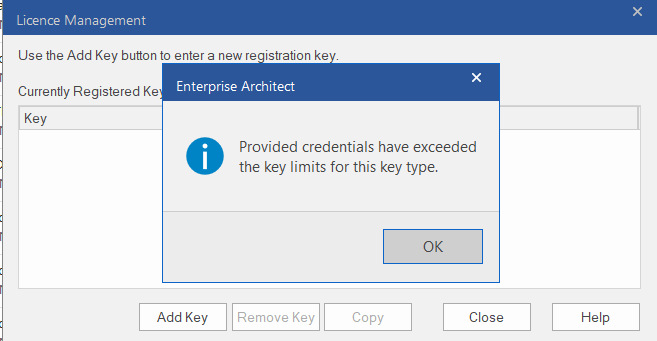 We would like to clarify that the "Provided Credentials have exceeded the key limits for this key type" message is not an error. It appears that all available license keys have been used up.
