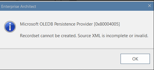 When attempting to connect to the model in EA, users encounter an error message stating "XML incomplete error." Any attempts to modify the repository result in this error.