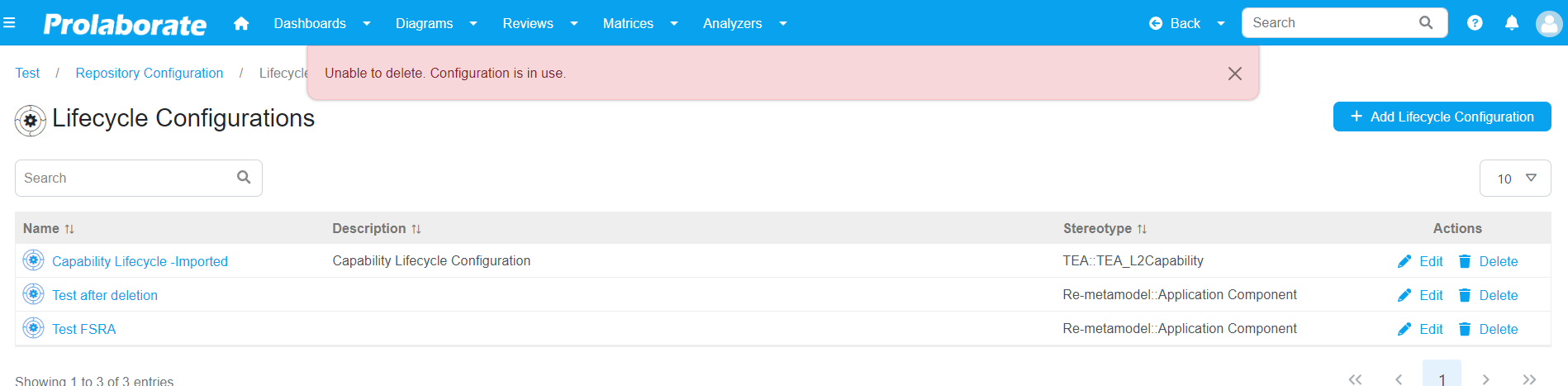 When the lifecycle configuration is currently in use in a dashboard widget, an error message saying "Unable to delete. Configuration is in use" will appear.