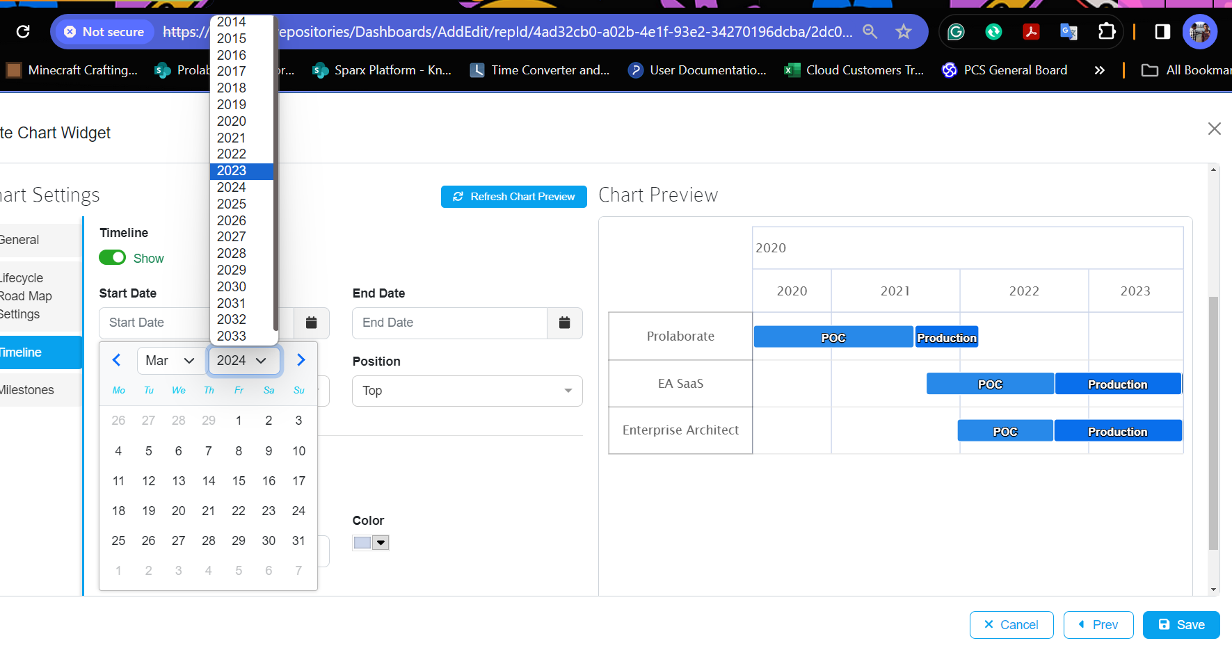 The Year field in the Lifecycle Roadmap's Timeline setting, only shows the past 10 years, and the users are not able to scroll up to find an earlier year.