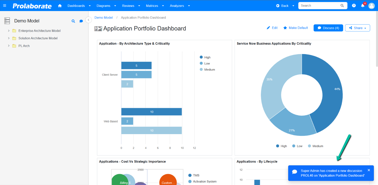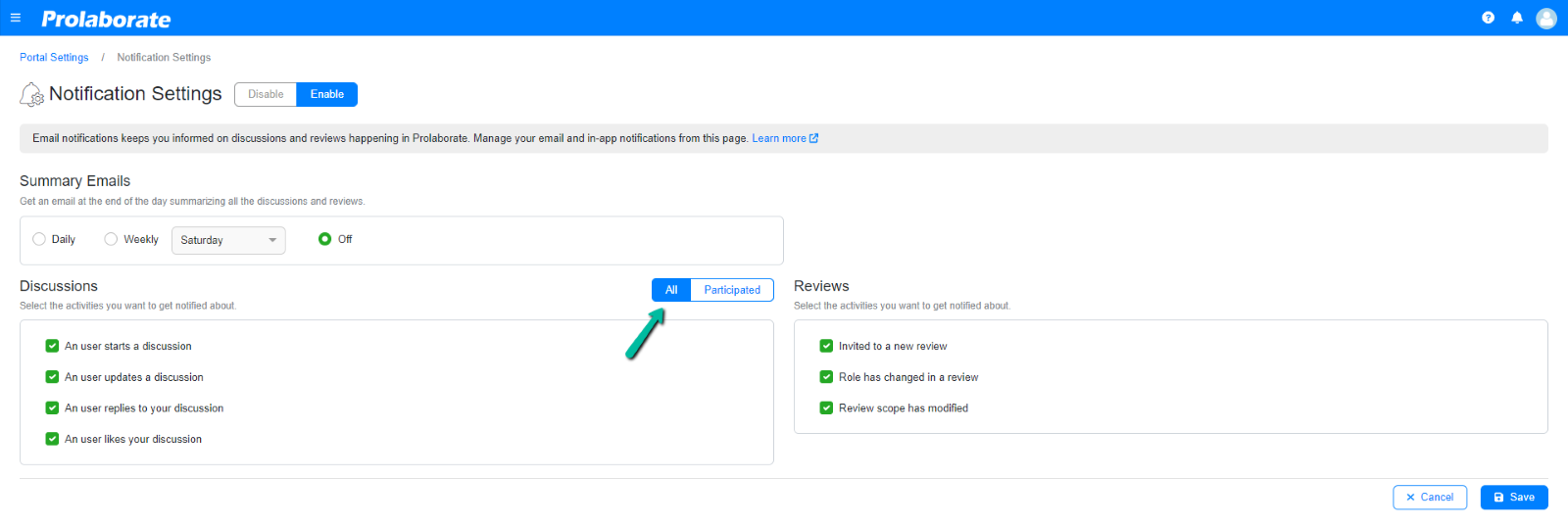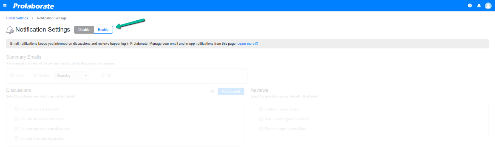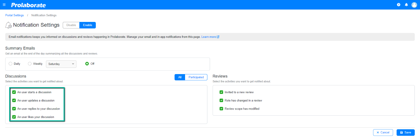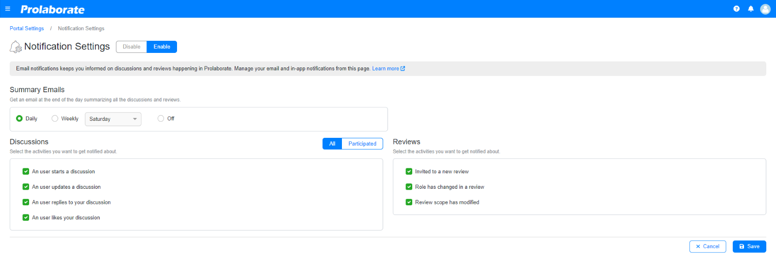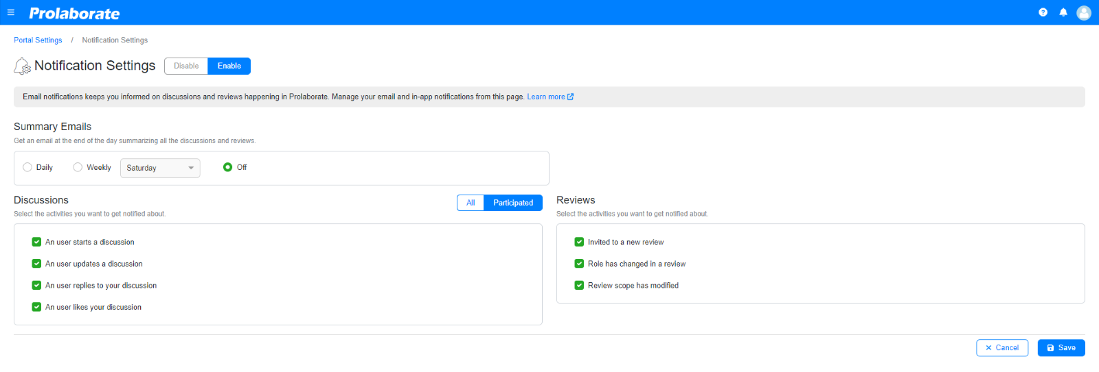 Prolaborate now displays discussions and review notifications as opt-in alerts that allows a user to take a specific action. Users can control the notifications based on the above settings.