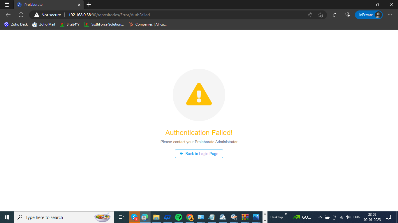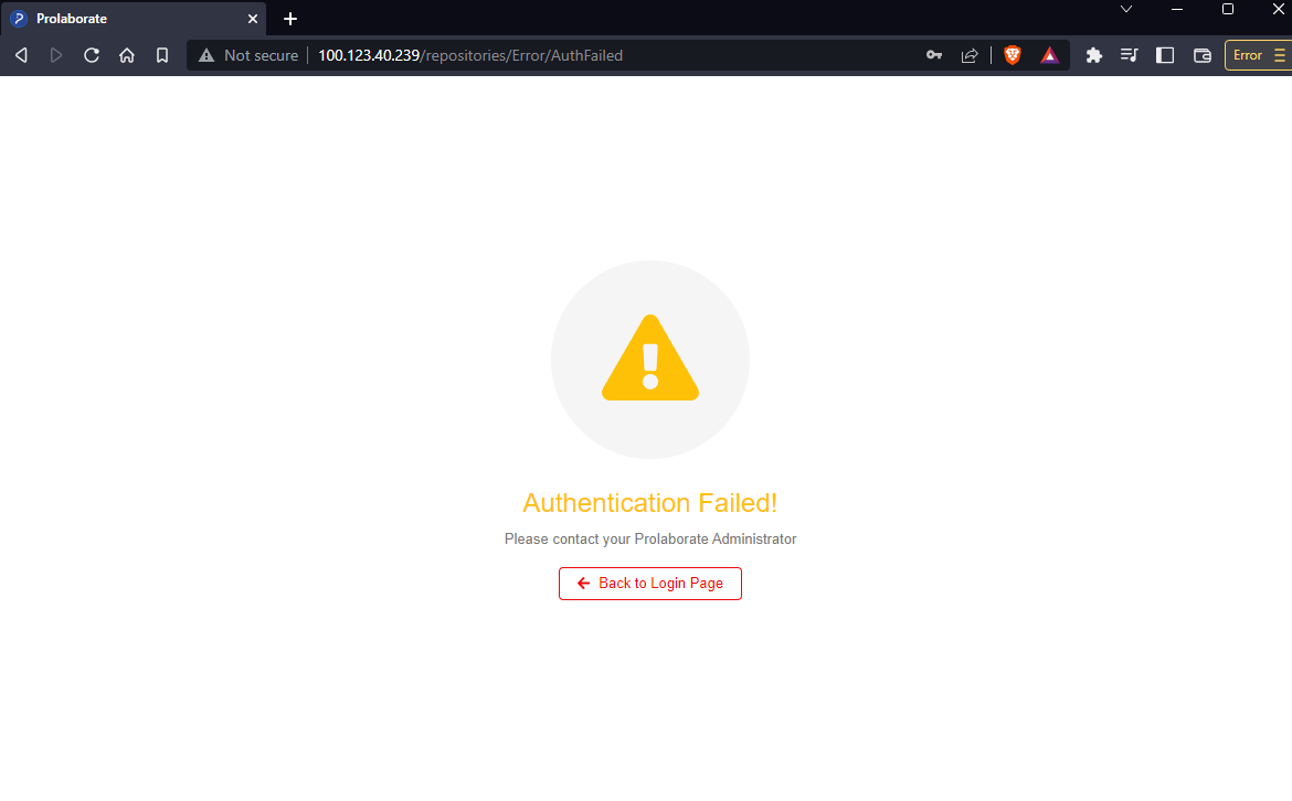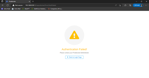 Using a bookmarked link to access Prolaborate - The Authentication Failed error occurs when we try to access Prolaborate using a bookmarked URL. The Below screenshots show the results of using a bookmarked link.