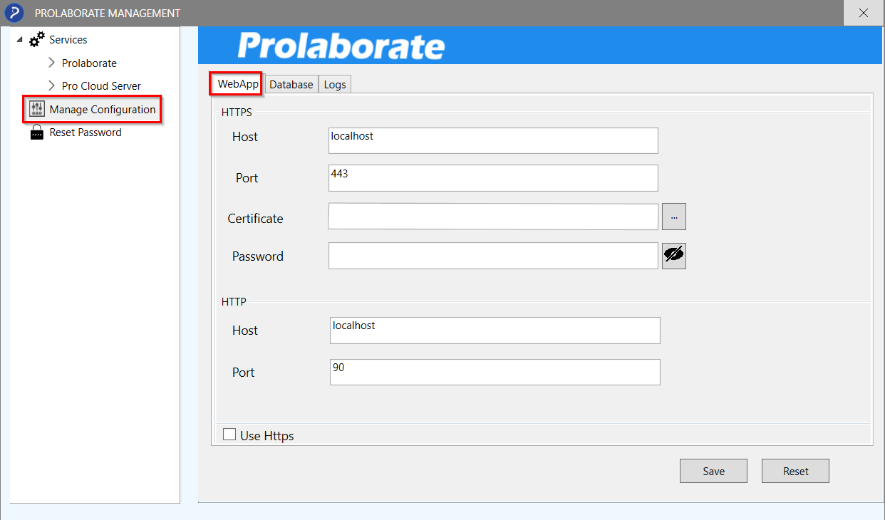 Step 2: In the Prolaborate Management application click “Manage Configuration” and then the “WebApp” tab.