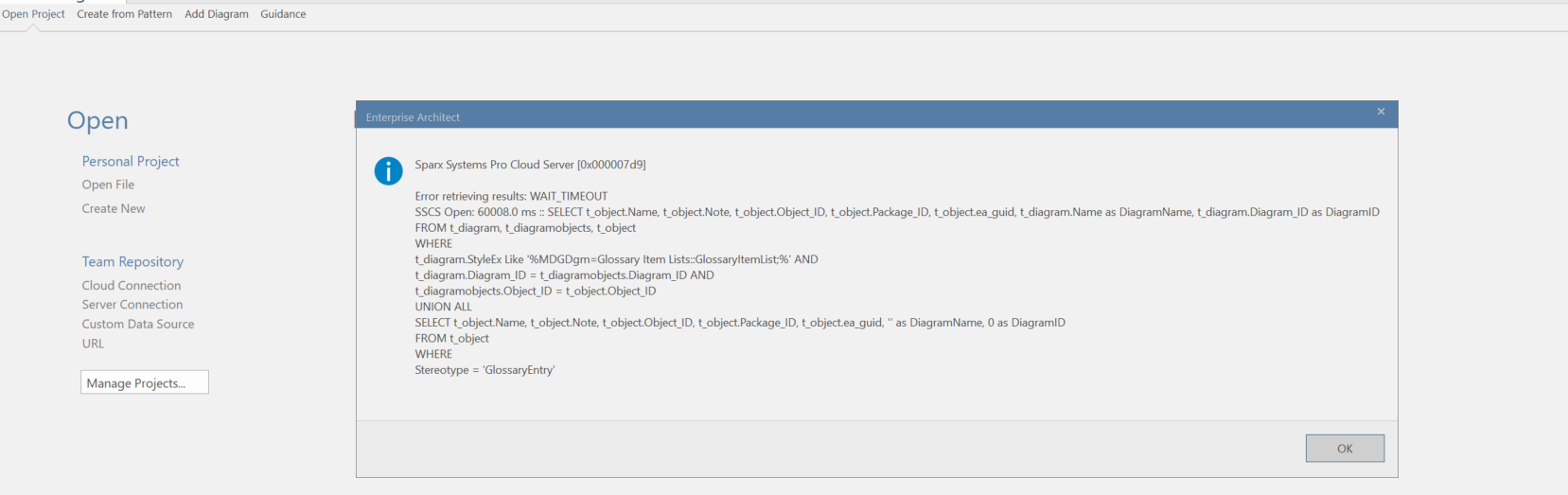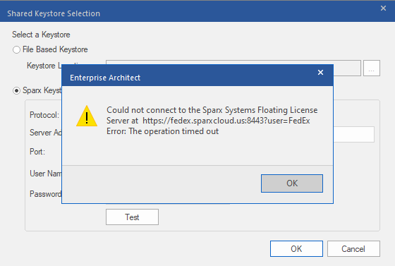Users faced errors while attempting to connect to the Sparx platform, indicating a possible outage on the Sparx database or servers.